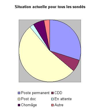 Les postes permanents sont des gens ayant une position stable, dans la recherche publique ou non ; cependant, d'après les réponses aux questions de la partie D/, concernant uniquement les anciens post-docs, on peut dire que la grande majorité des personnes classées dans la catégorie "Poste Permanent" sont insérées dans la recherche publique : 76% des sondés, et 93% des anciens astronomes ! ! Cela est probablement dû en grande partie à la difficulté de joindre les personnes ayant quitté la recherche.