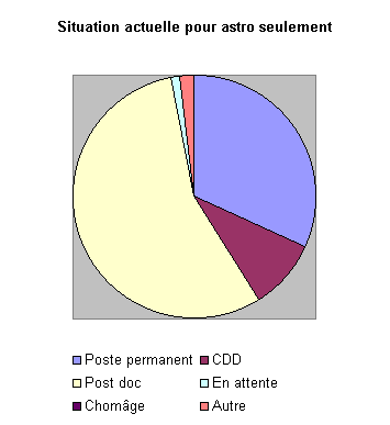 Les proportions sont les mêmes entre la population "Astro" et la population totale, la seule différence notable étant l'absence de chômeurs parmi les anciens astronomes sur une population plus importante. La plus grande partie des sondés se répartit donc entre "postes permanents" et post docs.
