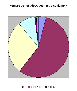 122 réponses ont été reçues, dont 81 venaient de post-docs ou anciens post-docs en astrophysique (et parmi ceux la, 62% venant de l'Ecole Doctorale d'Astronomie et Astrophysique d'Ile de France). Près de 80% d'entre eux sont des hommes, et ont entre 29 et 32 ans en moyenne, ayant soutenu leur thèse entre 26 et 29 ans. On voit bien d'ailleurs sur la réponse à la question sur l'âge de la soutenance, que celui-ci est assez divers, faisant donc de la règle de l'âge limite pour le concours du CNRS, une sélection assez arbitraire. Des réponses ont été obtenues pour des personnes allant jusqu'à 38 ans.
