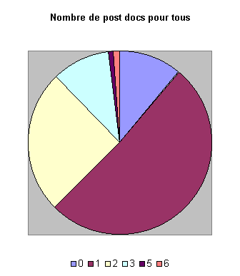 Plus de la moitié des sondés ne font qu'un post doc dans leur situation actuelle. Cependant, ce résultat peut être faussé par la plus grande facilité à joindre les docteurs récents, et donc les personnes en train d'effectuer leur premier ou deuxième (environ un quart des sondés) post-docs. On peut quand même noter que 2% des personnes ayant répondu en sont à leur 5e ou 6e post-doc ! !