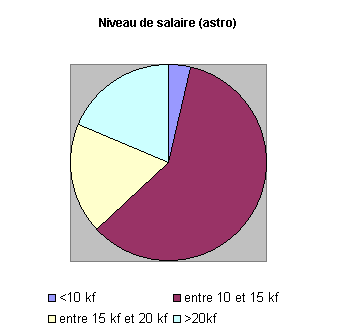 Pour l'ensemble des sondés ayant un emploi stable, la thèse a été reconnue et valorisée, plus au niveau intérêt du travail (79% , avec 86% pour les astronomes), qu'au niveau responsabilités ( 56% et 71%), et salaires (50%, et 57%). Les niveaux de salaires actuels sont répartis de la façon suivante :